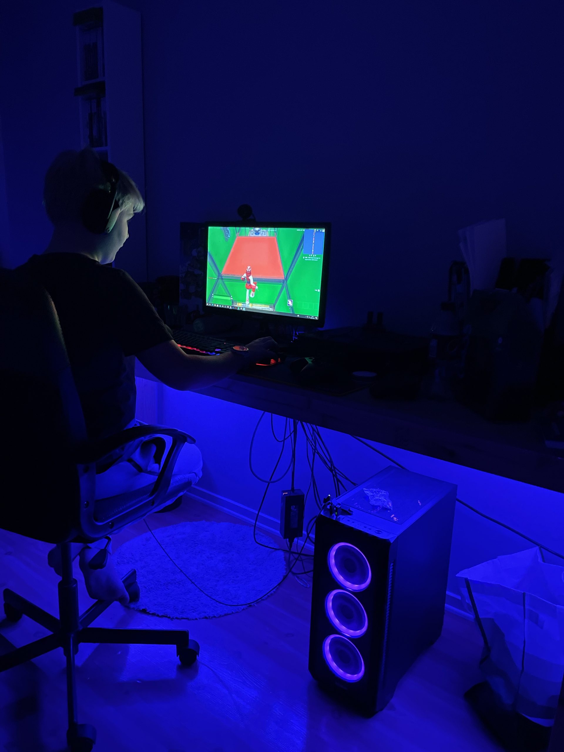 Jag hade blivit knas på att ha det här blåa ljuset men han tycker att det passar hans gaming set-up. Han fick en ledlist med olika färger i julklapp, den sitter nu under skrivbordet och lyser i den färg han passar honom den dagen. Ja herregud den kan blinka också, det hade jag verkligen inte klarat av. Datorchassit fick han i födelsedagspresent och det lyser också, såklart. Även chassit kan blinka och ha sig. Taklampan köpte vi till honom för något år sedan, det är såklart också ställbar i olika färger och olika styrkor. Förstår ni hur det kan se ut på hans rum? Men det är ju hans rum